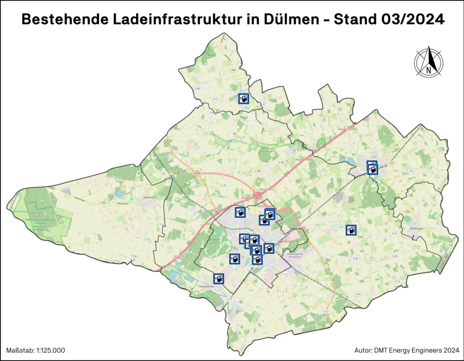 Aufbauend auf den bereits vorhandenen Ladesäulen und der Entwicklung der E-Fahrzeuge wurde der weitere Bedarf an Ladeinfrastruktur für Dülmen ermittelt. Hierfür wurde die zukünftige Anzahl an E-Pkw in Dülmen und der damit zusammenhängende Ladebedarf im öffentlichen Bereich abgeschätzt. Im November 2024 wurde das Konzept im Umweltausschuss vorgestellt. Die Stadtverwaltung fungiert dabei als zentrale koordinierende Akteurin: Der Aufbau und Betrieb der Ladeinfrastruktur obliegt überwiegend wirtschaftlichen Akteuren.
