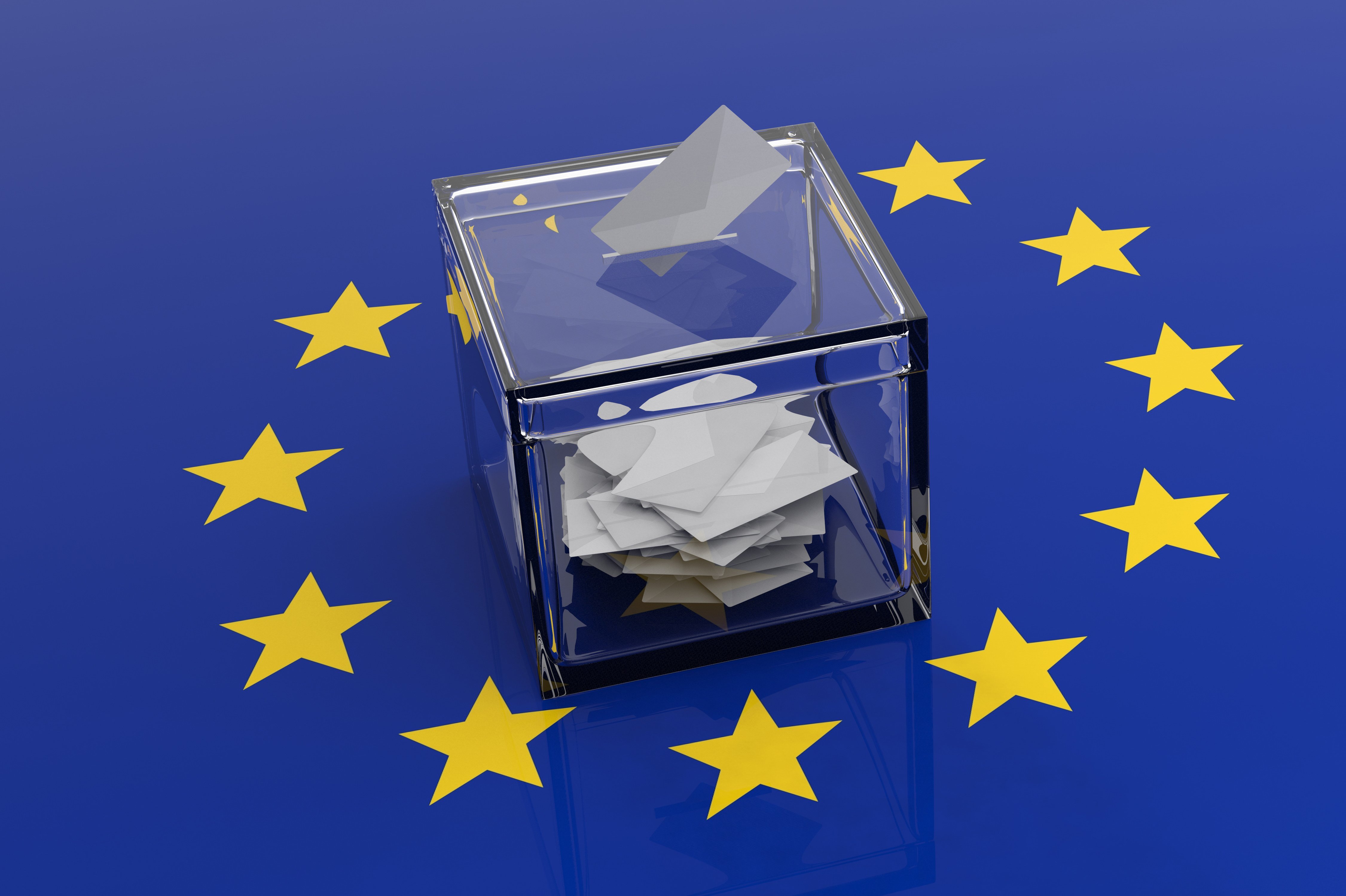 Das Foto zeigt eine durchsichtige Wahlurne auf einer Europa-Flagge.