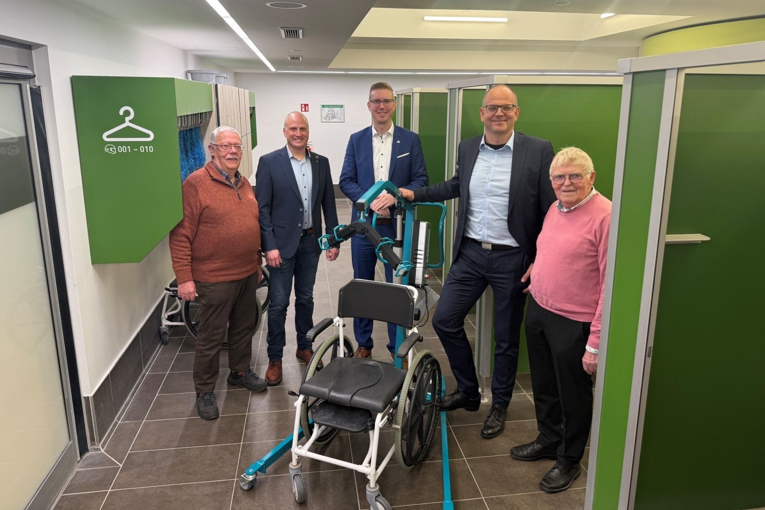 Die beiden städtischen Behinderten-Beauftragten Wolfgang Großmann (l.) und Heinz Steentjes (r.) übergaben jetzt gemeinsam mit Bürgermeister Carsten Hövekamp (m.) und Thomas Reher (Vorsitzender Behindertenhilfe e.V., 2.v.r.) den Lifter und die Therapieliege an düb-Geschäftsführer Burkhard Demes (2.v.l.). (Foto: Freizeitbad düb)