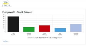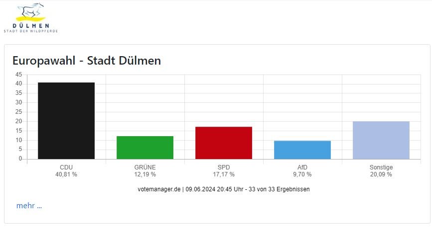 Die Ergebnisse der Europawahl aus Dülmen liegen vor: Die CDU kommt auf 40,81 Prozent, die SPD auf 17,17 Prozent, Bündnis 90/Die Grünen auf 12,19 Prozent und die AfD auf 9,7 Prozent. Insgesamt 20,09 Prozent entfallen auf andere Parteien. Alle Informationen zu den Wahlergebnissen in Dülmen finden Sie hier.