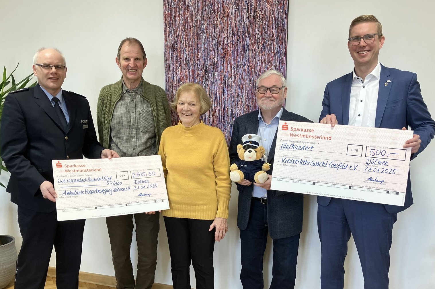 Die ersten 500 Euro gingen an die Kreisverkehrswacht Coesfeld e.V., die mit dem Geld neue Teddybären für an Unfällen beteiligte Kinder anschaffen möchte. „Wir geben die Teddys an die Dienststellen der Polizei weiter, die sie wiederum auf ihre Einsatzfahrzeuge verteilen“, erläutert Hans-Jürgen Lobbe, Geschäftsführer der Kreisverkehrswacht. „Wenn Kinder einen Unfall oder eine ähnliche Situation miterleben, kann so ein Teddybär in Polizei-Uniform ein kleiner Lichtblick sein.“ Im vergangenen Jahr waren bei einem Unfall mit einem Schulbus in Dülmen zahlreiche Teddybären gebraucht worden. Nun kann der Bestand wieder aufgefüllt werden.