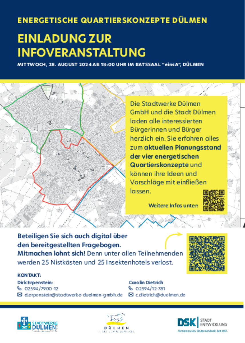 Die Stadt Dülmen arbeitet in Kooperation mit den Stadtwerken Dülmen und gemeinsam mit zwei Fachbüros an einer klimagerechten Wärmeplanung. Dazu werden fünf sogenannten Quartierskonzepte erstellt. Aktuell werden Wärmequellen und -bedarfe in den Quartieren Dülmen-Mitte und Buldern erfasst.